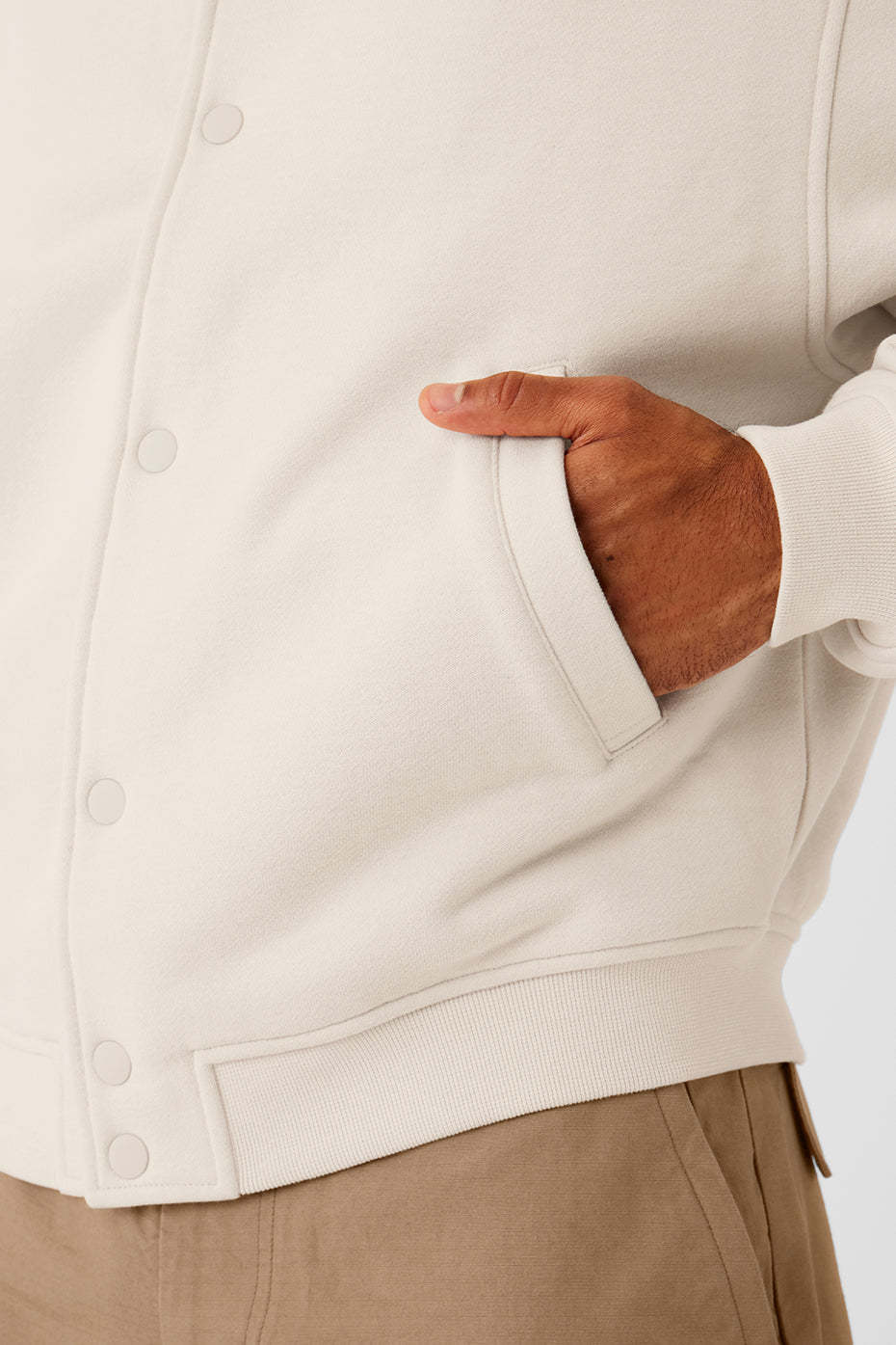 Add a new game-changing layer to your rotation. The Renown Varsity Jacket is made from comfy, heavyweight French terry with drop shoulders, a button front closure, and a smooth look and feel that nails the cool, street-ready vibe. Front slip pockets are handy for storing keys, phone and small essentials on the go.