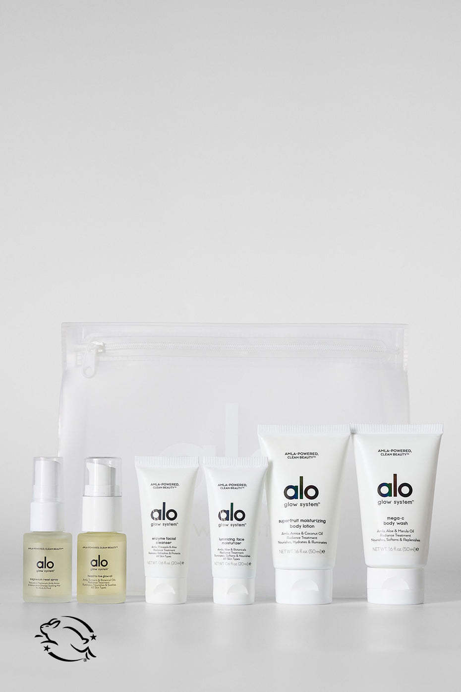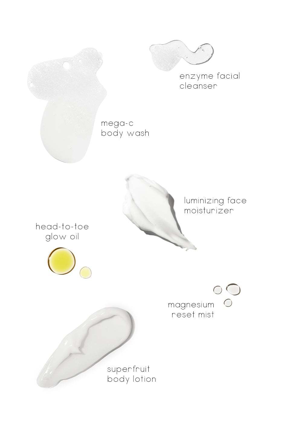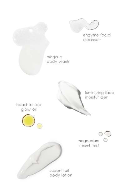 - Includes 6 Glow System products for face & body! Travel-ready bag contains Enzyme Facial Cleanser (net wt. 0.7 fl. oz), Luminizing Face Moisturizer (net wt. 0.7 fl. oz), Mega-C Body Wash (net wt. 1.7 fl. oz), Superfruit Body Lotion (net wt. 1.7 fl. oz), Head-to-Toe Glow Oil (net wt. 0.4 fl. oz) and Magnesium Reset Spray (net wt. 0.4 fl. oz)