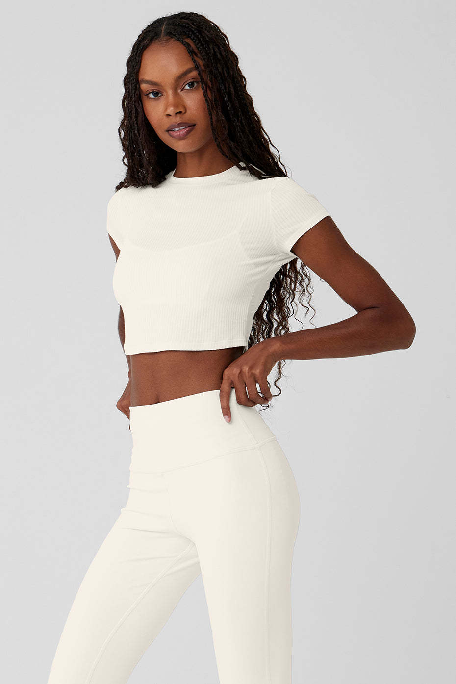 Cut from a soft, stretchy, ribbed fabric blend, this trusty tee is a closet staple you*ll want to buy in multiples. It has a classic crewneck, a slim fit, and not-too-short, not-too-long cap sleeves. Finished with a waist-length crop to pair perfectly with all your favorite high-waisted bottoms.