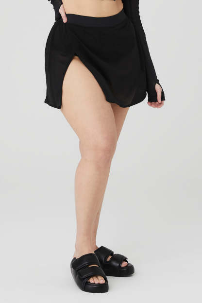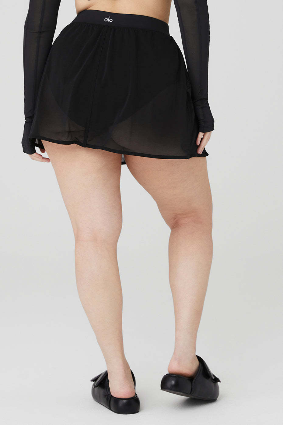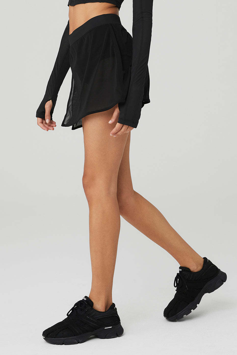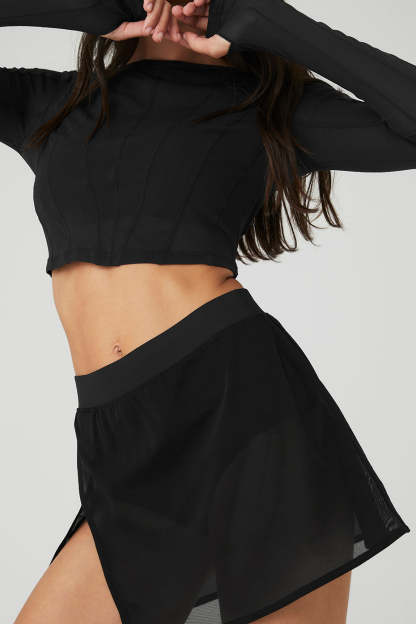 Of-the-moment mesh. Find newfound bliss for practice or pavement with the Mesh Sheer Bliss Skirt 〞 an ultra-comfy jersey knit brief with hidden card pocket peeks through a sheer mesh overlay skirt with a high slit for elevated movement on the court and a bold statement off. Make it sheer perfection with the Mesh Cropped Fine Line Long Sleeve.