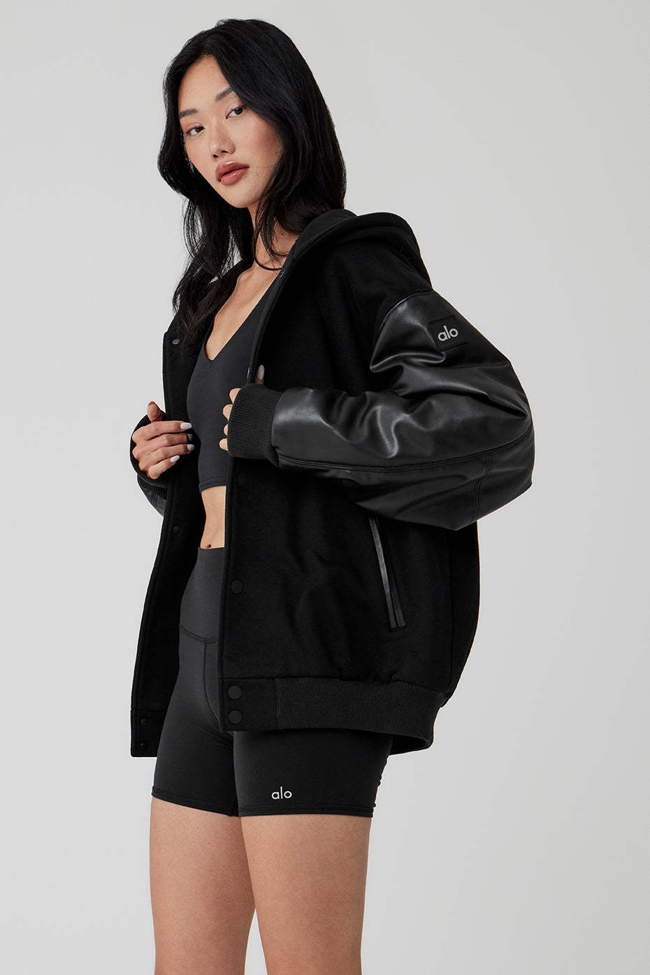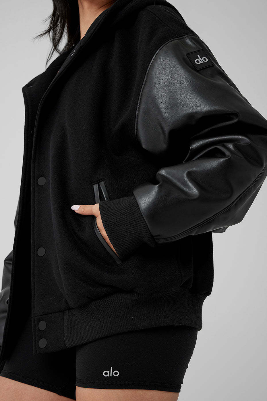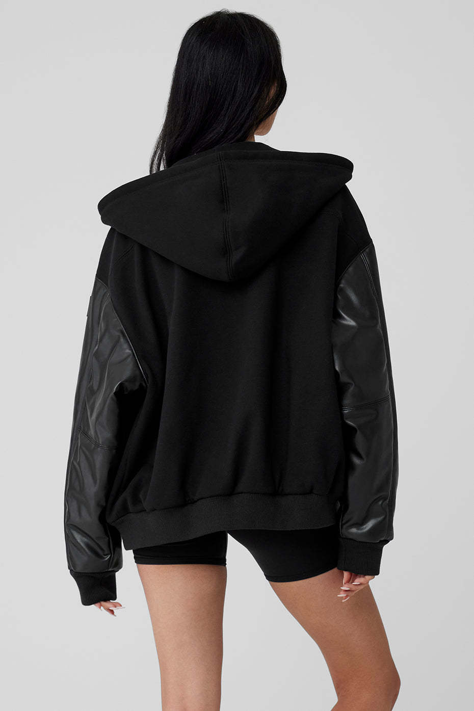 - Heavyweight French terry body with faux leather sleeves