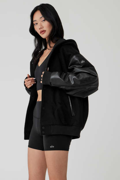 Everybody needs a bomber jacket〞especially one like this, that can go from street to sleek in the blink of an eye. It has a slightly oversized fit that hits at the high hip with a heavyweight French terry body and lightly filled faux leather sleeves. The ribbed hem and cuffs keep cold air out, and it*s finished with matte snaps, side pockets and a wind-defying hood. Grab yours and get ready to wear it on repeat.
