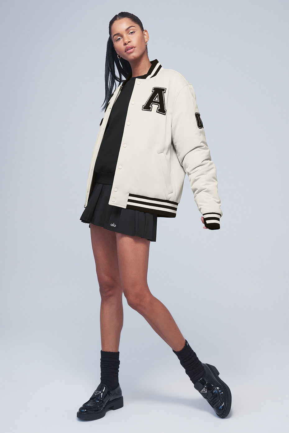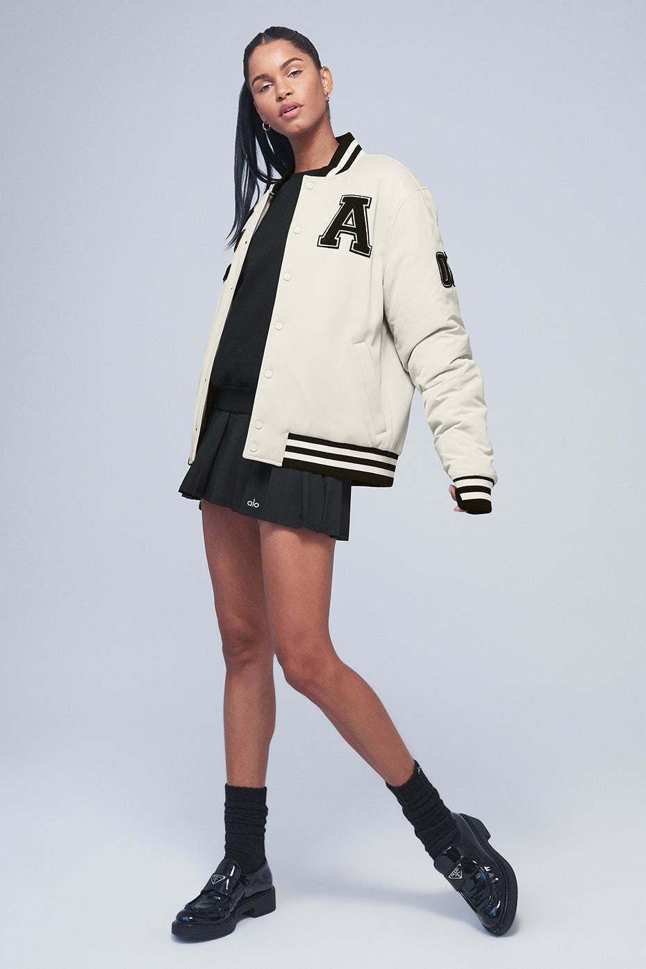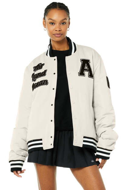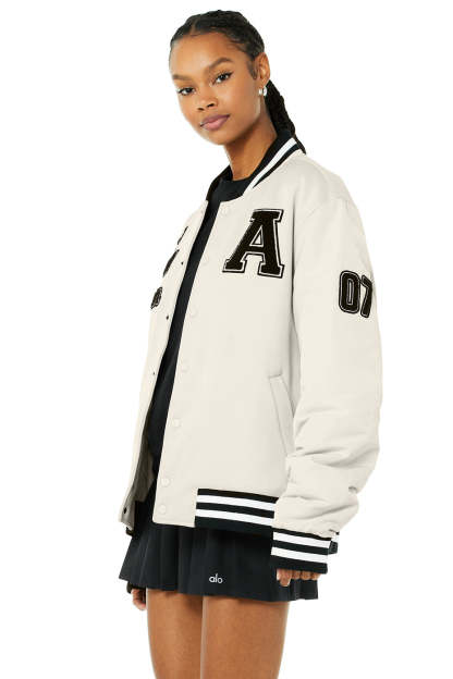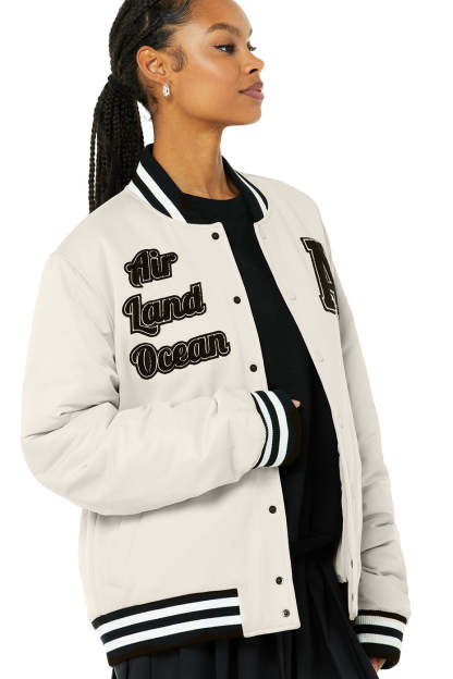 - Varsity letterman jacket design with iconic patches