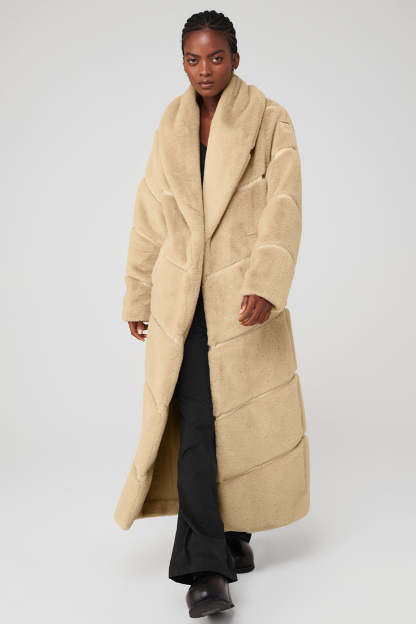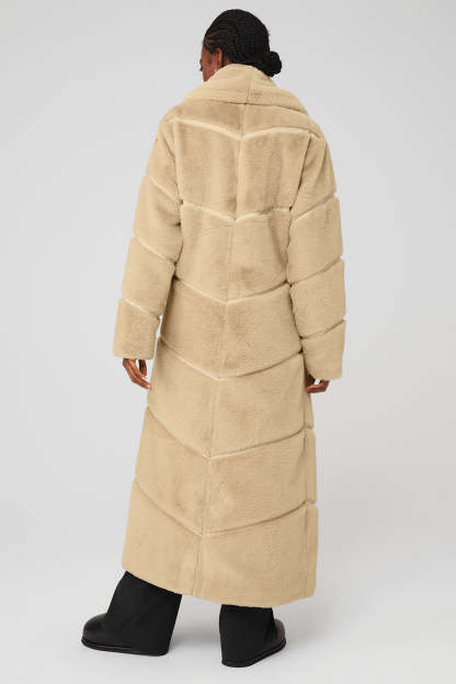 A forward take on the iconic, floor-length fur coat, the Faux Fur Cascade Jacket is a sweeping statement made in plush, unbelievably realistic, cruelty-free fur lined with satin. Buttery faux-leather chevron splicing creates depth and dimension, while an exaggerated shawl collar provides added warmth. Zippered front pockets and a hook-and-eye closure add functionality to this floor-length look.
